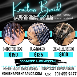 This service include braiding only. Your hair must be already shampooed and blow dried. ($25 extra if not) price may change depending on the size of your desired length .You need